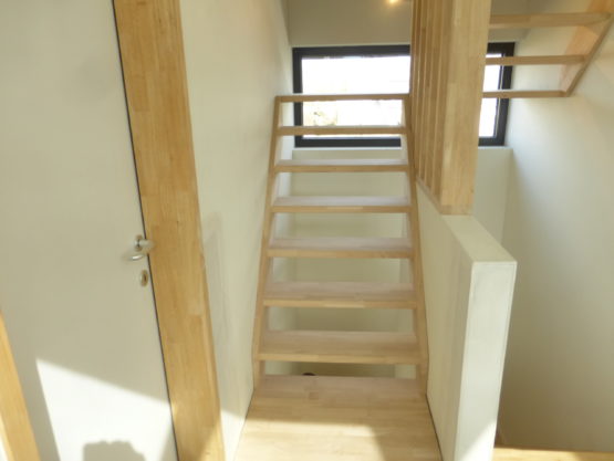 Trappen maken we op maat en volgens uw keuze. In onze toonzaal staat een trap gemaakt uit gelamelleerde rubberwood afgewerkt met olie wit.